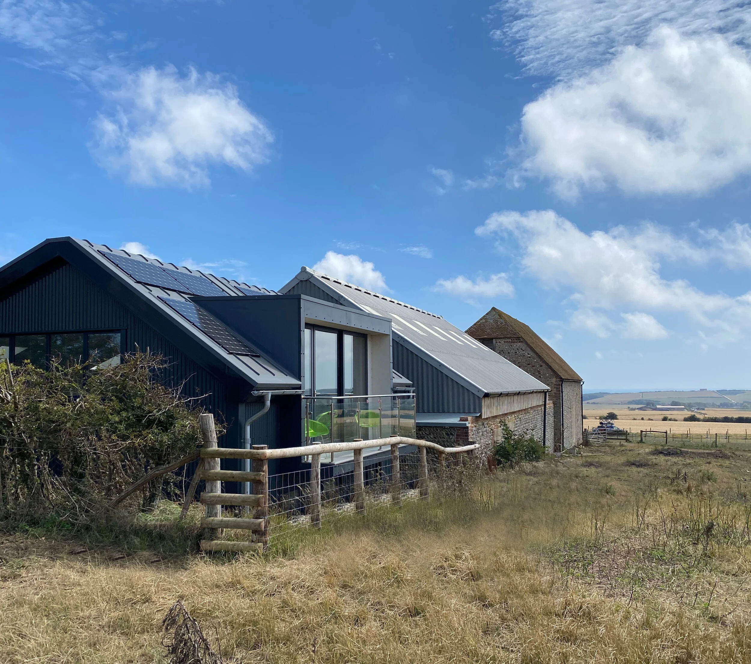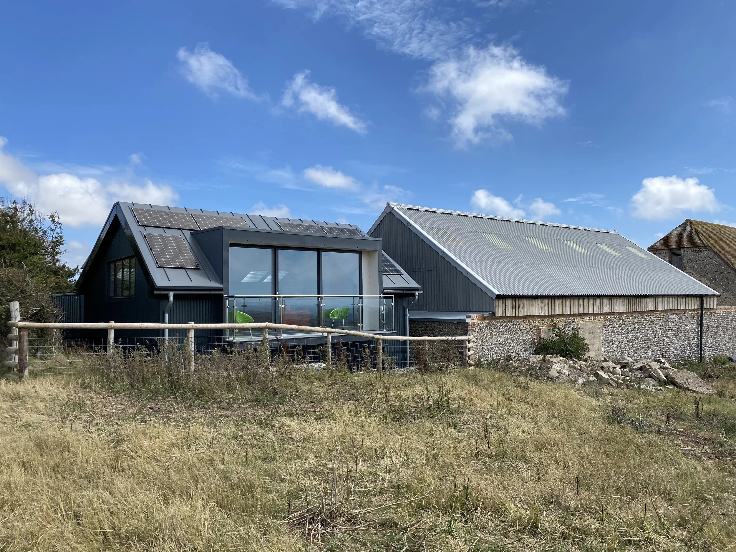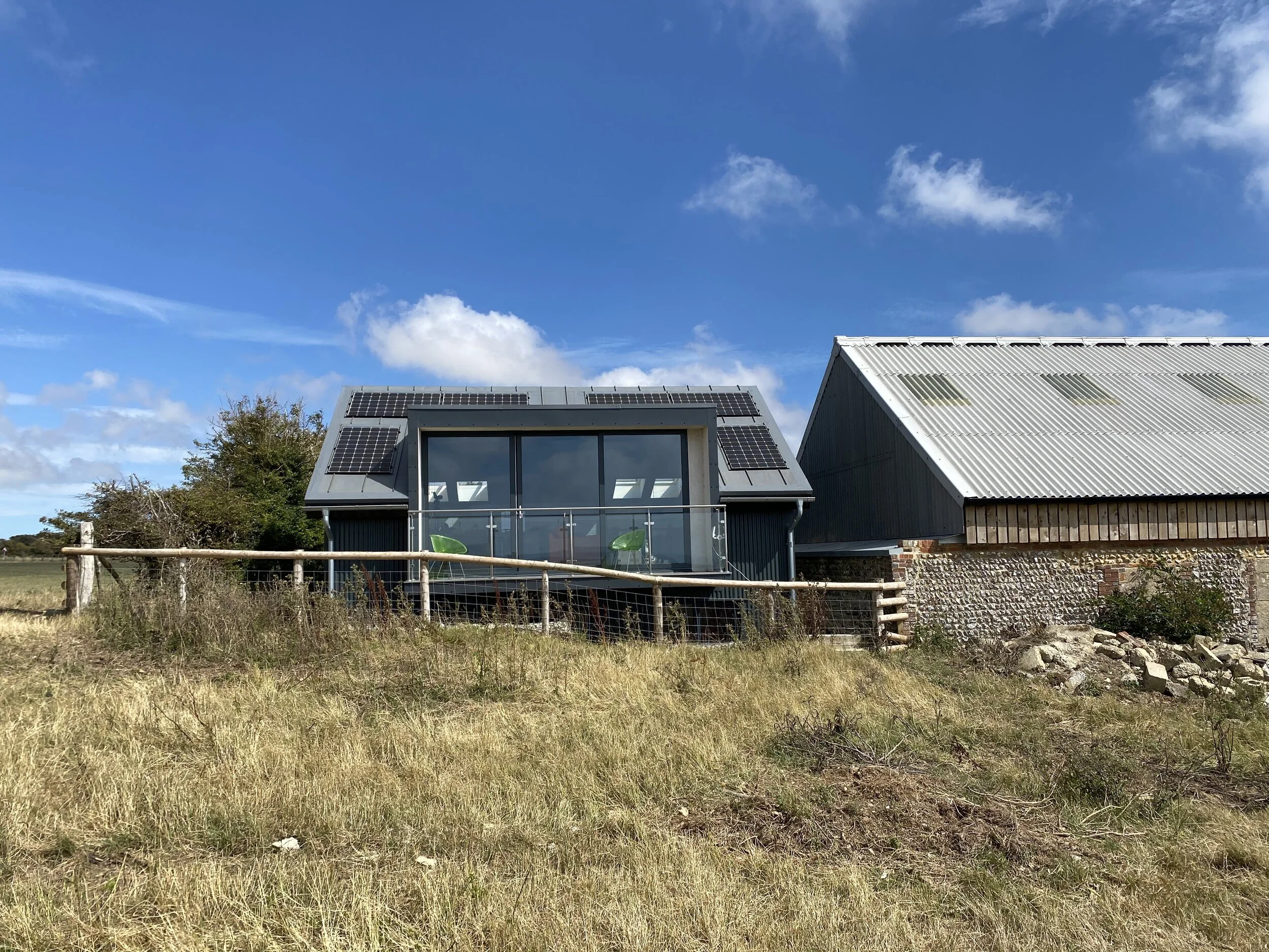 Set within the beautiful South Downs National Park, this great little home has the most stunning, panoramic views and benefits from being totally off grid. The owners had owned the site for some years and had tried obtaining planning consent to replace a domestic garage with a two bedroom house. This sensitive location is very close to two traditional flint barns owned by the National Trust so planning for any dwelling was always going to be challenging! After the previous scheme submitted was turned down at appeal, the owners made contact as they heard I had designed the buildings for Rathfinny Wine Estate close by. My approach was to set the building below ground level, where the two bedrooms are situated, this would ensure the ridge level was below the ridge height of the adjacent barn. All of the elevations are clad in coated, corrugated metal sheets to reference the agricultural buildings close by. This new approach was accepted by the planning authority and gained full planning consent.