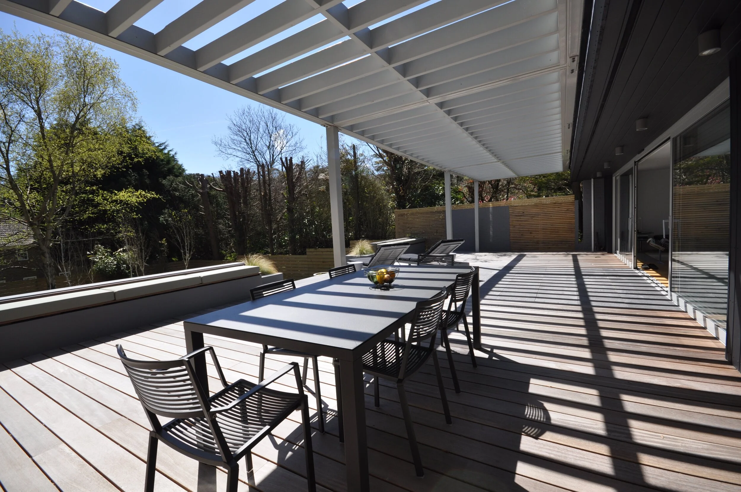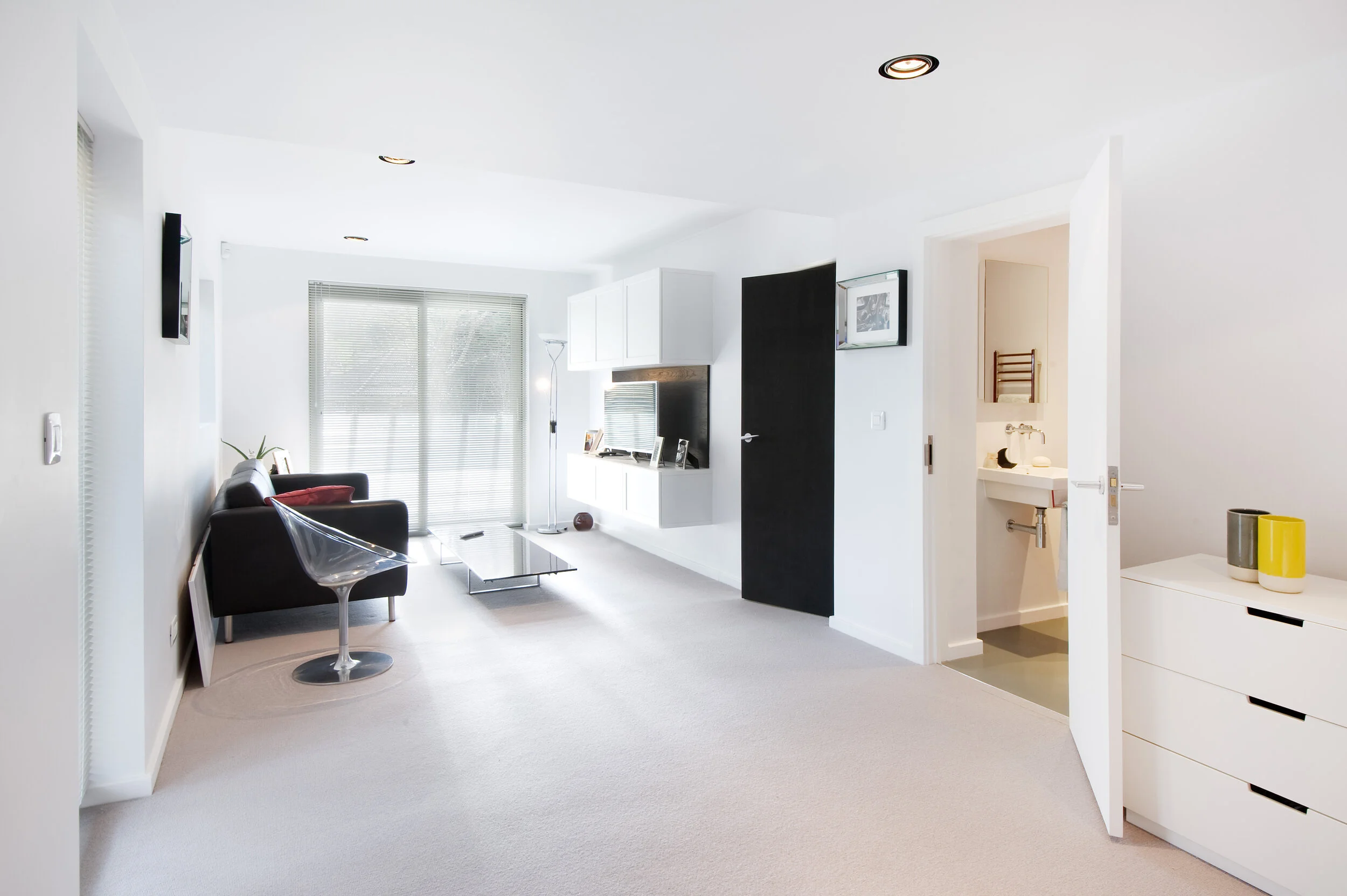 This interesting house built in the 50s started life as a double garage with a flat above and served as the chauffeur’s accommodation for the large house next door. In the mid seventies, it was bought by a local architect who extended the property to provide a family home. Peter Grant, manager of Led Zeppelin owned the property for many years and it remained in the family until my client purchased it at the end of 2013. I was given a brief to remodel the house and completely update every element of the infrastructure. The integral double garage became a large kitchen with dining area opening out to the south facing living room. Features include: bespoke staircase balustrade, self contained studio, bespoke entertainment centre, wide board oak flooring, unique en suites, huge south facing terrace, blackened larch cladding, grey aluminium windows and doors, meadow garden.